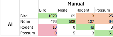 The orange cells show where the AI either saw a bird or nothing… but there was a predator there. That’s bad because that’s an opportunity lost to kill the predator. (Nothing that the majority of the possum errors were a dead possum under the kill bar!)
