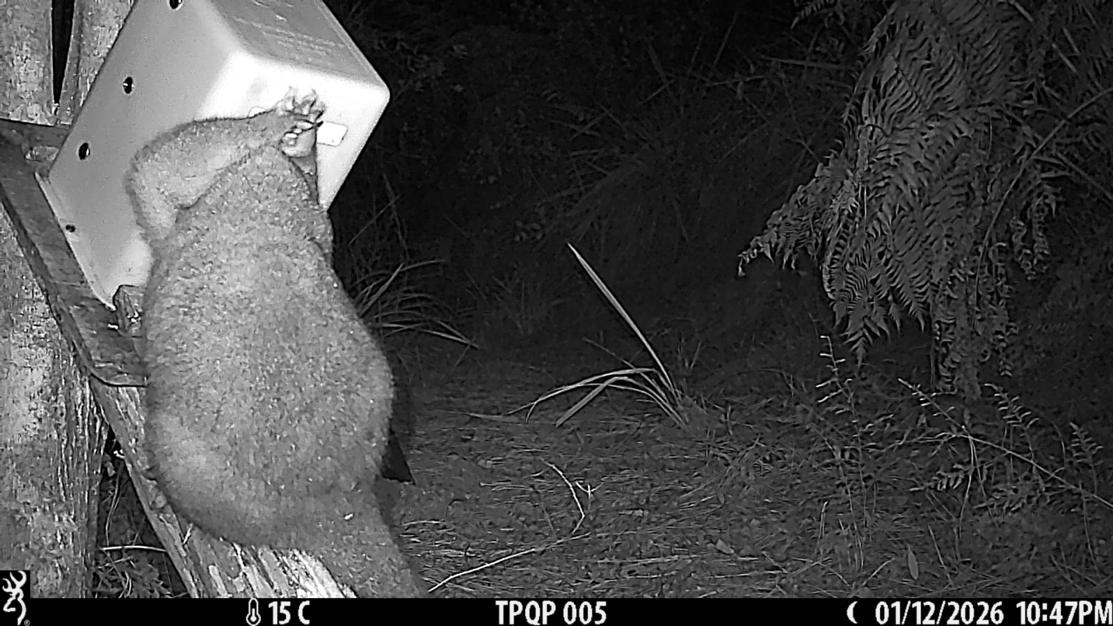 I have been using cameras on a few sites over the last three months or so and they really open your eyes to how animals are reacting around traps. Rats seem to be experts at getting inside a Timms and setting it off without getting caught. An unset Timms is a great place for a possum to lick out all the sweet treats – possum paste, blue, vanilla and green stuff. I recently observed a possum hanging in a vertical mounted unset Timms with just his back legs hanging out and enjoying thre various lures inside the box – so I remounted the Timms horizontal and on the top of the ramp. I then observed the possum well caught in the trap – front legs out and working hard to escape. The next video clip showed him pulling out and running off. I have reverted to the vertical mount and now see the same possum coming back to carefully lick all the sweet stuff just inside the trap – he has been very careful not to pull the bait rod – a very high risk operation and I expect to catch him on the next lot of videos I will retrieve tomorrow. He is also very careful not to touch a possum master 50m down the track – but one of his mates did make the fatal mistake a few days ago.